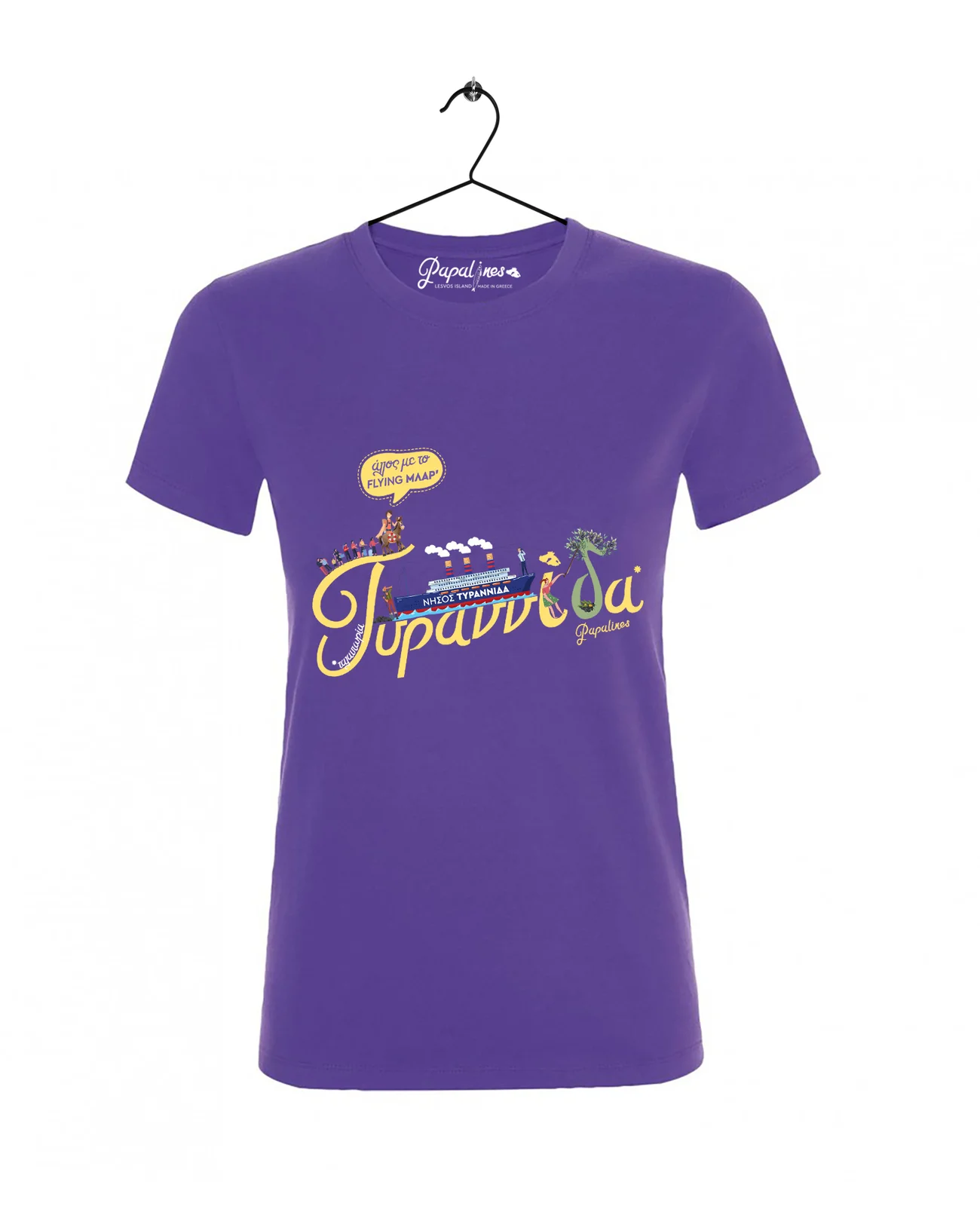 Τυραννίδα στη Λέσβο λέμε την ταλαιπωρία. Χρησιμοποιούμε συχνά την λέξη “τυραννίδα” όταν έχουμε ταλαιπωρηθεί από κάτι που κάναμε και κουραστήκαμε ή από μια κατάσταση που ζήσαμε. Στο σχέδιο μας η πρώτη σκέψη στο άκουσμα της ατάκας αυτής, ήταν η ταλαιπωρία που περνάμε χρόνια τώρα, στις μετακινήσεις μας με τα καράβια. Έτσι λοιπόν με χιουμοριστικό τρόπο σχεδιάσαμε το πλοίο “Νήσος Τυραννίδα“*.