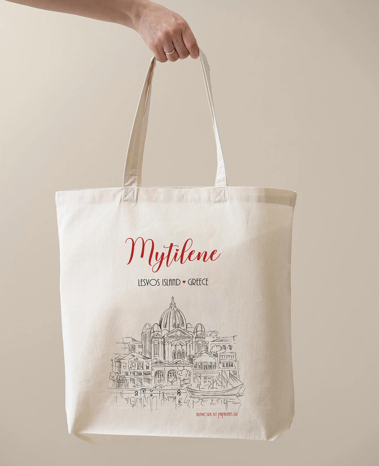 Η προκυμαία της Μυτιλήνης με τον επιβλητικό ιερό ναό του Αγίου Θεράποντα, σχέδιο ζωγραφισμένο στο χέρι το οποίο τυπώθηκε σε τσάντα. Η αρχόντισσα του αιγαίου όπως την βλέπει ο επισκέπτης μόλις φτάνει με το καράβι.