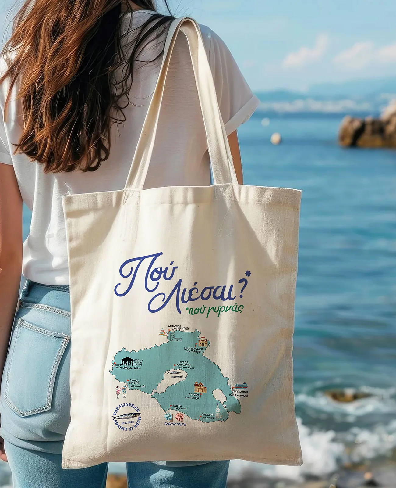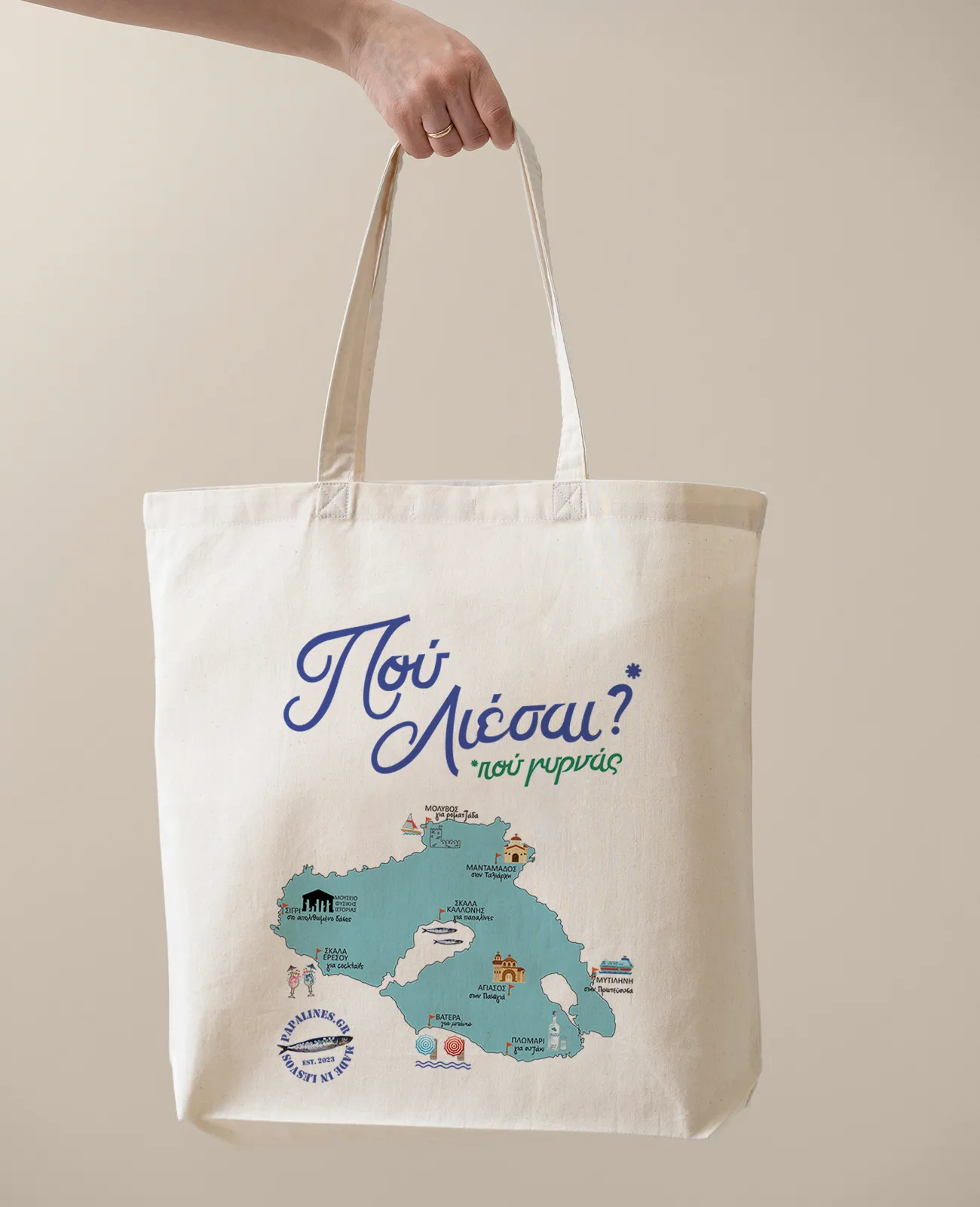 Πού λιέσαι; Δηλαδή που γυρνάς, πού χάθηκες; Μια ερώτηση που ακούγαμε απο τους παππούδες μας και τους φίλους τους, όταν λείπαμε για πολύ ώρα και δεν ήξεραν που ήμασταν. Το συνδυάσαμε με σχέδιο την Λέσβο και τις ομορφιές της ανα περιοχή.